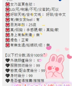 可配合 :奶砲,按摩,69,陪洗,共浴,帝王浴,LG(舌吻)依氣氛衛生而定,可親嘴,無套吹,足交,舔蛋,輕功,漫遊,奶推,冰火,冰塊(客自備),海底撈月,浴中蕭,深喉嚨,艷舞秀,變裝(自備免付),絲襪(自備免付),快餐