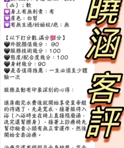 可配合 :奶砲,毒龍,按摩,69,共浴,LG(舌吻)依氣氛衛生而定,可親嘴,無套吹,口爆,吞精,足交,品鮑,顏射,變裝(自備免付),玩具(按摩棒),玩具(跳蛋),情趣用品(客自備),後門,自慰秀,中文溝通,快餐,2S,包夜
