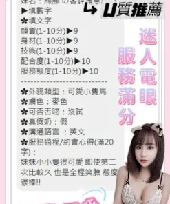 可配合 :按摩,69,共浴,泰國浴,LG(舌吻)依氣氛衛生而定,可親嘴,無套吹,口爆,品鮑,舔蛋,冰火,絲襪(自備免付),玩具(按摩棒),玩具(跳蛋),情趣用品(客自備),中文溝通,快餐,2S