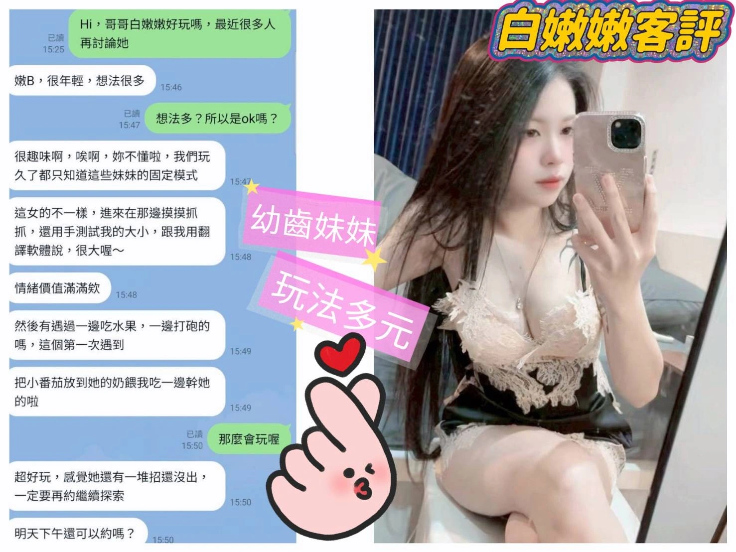 可配合 :LG(舌吻)依氣氛衛生而定,可親嘴,無套吹,口爆,顏射,無套做,無套內射,英文溝通,快餐