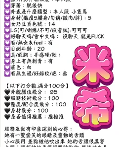 可配合 :奶砲,按摩,69,共浴,LG(舌吻)依氣氛衛生而定,可親嘴,無套吹,品鮑,顏射,深喉嚨,變裝(自備免付),自慰秀,快餐,2S,包夜