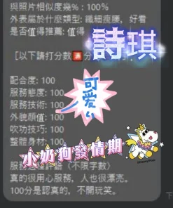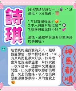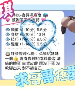 可配合 :奶砲,按摩,69,共浴,殘廢澡,LG(舌吻)依氣氛衛生而定,可親嘴,無套吹,品鮑,舔蛋,輕功,快餐,2S,包夜