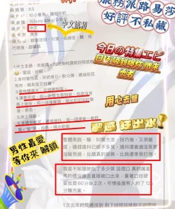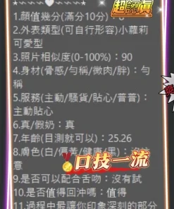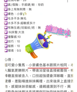 可配合 :按摩,69,共浴,泰國浴,LG(舌吻)依氣氛衛生而定,可親嘴,無套吹,口爆,潮吹(依貴賓技術而定),品鮑,舔蛋,屁推,冰火,顏射,深喉嚨,變裝(自備免付),玩具(按摩棒),玩具(跳蛋),情趣用品(客自備),後門,自慰秀,攝影,中文溝通,快餐,2S,NS,射後清槍