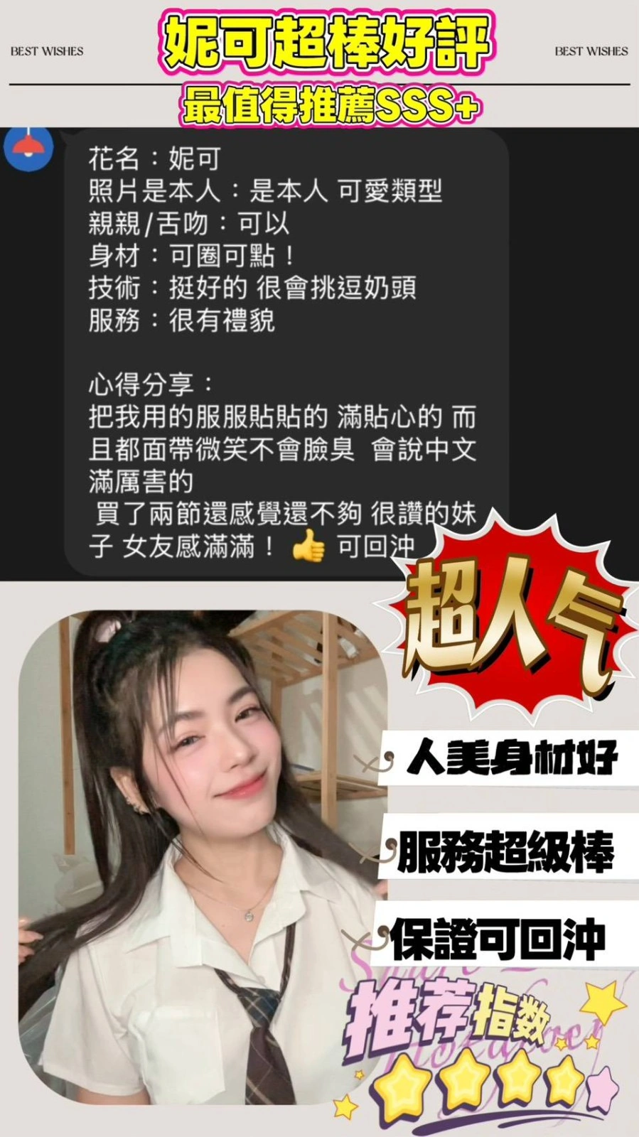 可配合 :按摩,共浴,可親嘴,無套吹,品鮑,奶推,變裝(自備免付),絲襪(自備免付),快餐,2S