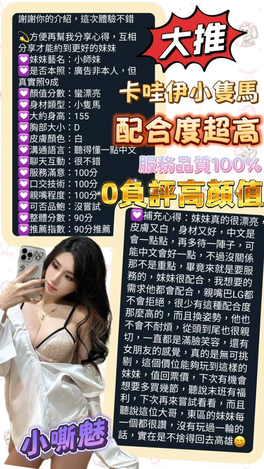 可配合 :奶砲,按摩,69,陪洗,共浴,LG(舌吻)依氣氛衛生而定,可親嘴,無套吹,品鮑,舔蛋,顏射,快餐,2S