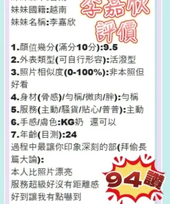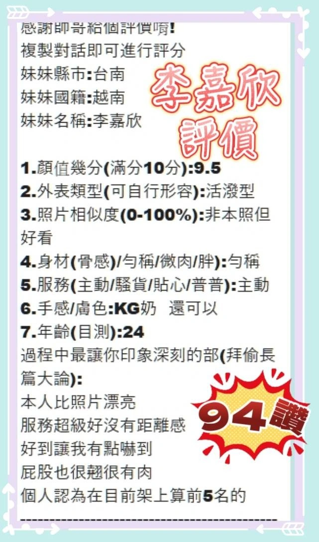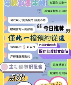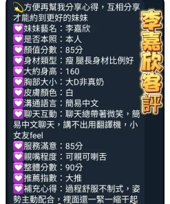 可配合 :奶砲,按摩,69,共浴,LG(舌吻)依氣氛衛生而定,可親嘴,無套吹,品鮑,舔蛋,絲襪,中文溝通,快餐,2S