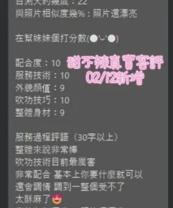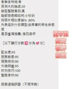 可配合 :奶砲,按摩,69,共浴,LG(舌吻)依氣氛衛生而定,可親嘴,無套吹,品鮑,舔蛋,奶推,屁推,冰火,絲襪,玩具(按摩棒),玩具(跳蛋),快餐,2S