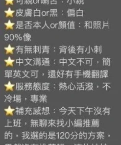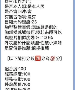 可配合 :奶砲,按摩,共浴,泰國浴,LG(舌吻)依氣氛衛生而定,可親嘴,無套吹,口爆,品鮑,舔蛋,冰火,顏射,海底撈月,艷舞秀,變裝,絲襪,自慰秀,快餐,2S