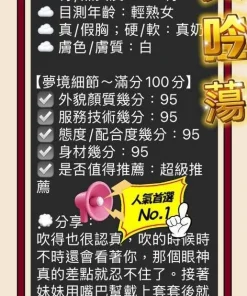 可配合 :奶砲,毒龍,按摩,共浴,泰國浴,LG(舌吻)依氣氛衛生而定,可親嘴,無套吹,口爆,吞精,品鮑,舔蛋,過水,漫遊,冰火,顏射,海底撈月,變裝,絲襪,玩具(按摩棒),玩具(跳蛋),情趣用品(客自備),無套做,後門,快餐,2S