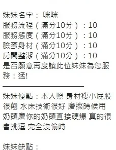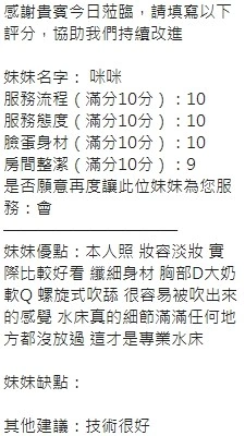 可配合 :奶砲,按摩,69,共浴,LG(舌吻)依氣氛衛生而定,可親嘴,無套吹,口爆,品鮑,舔蛋,奶推,屁推,顏射,水床浴,變裝(自備免付),絲襪(自備免付),快餐,2S,包夜