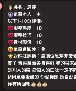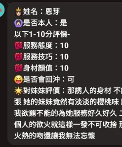 可配合 :奶砲,毒龍,按摩,69,共浴,殘廢澡,泰國浴,LG(舌吻)依氣氛衛生而定,可親嘴,無套吹,口爆,品鮑,舔蛋,奶推,屁推,絲襪(自備免付),無套做,無套內射,快餐,2S,NS