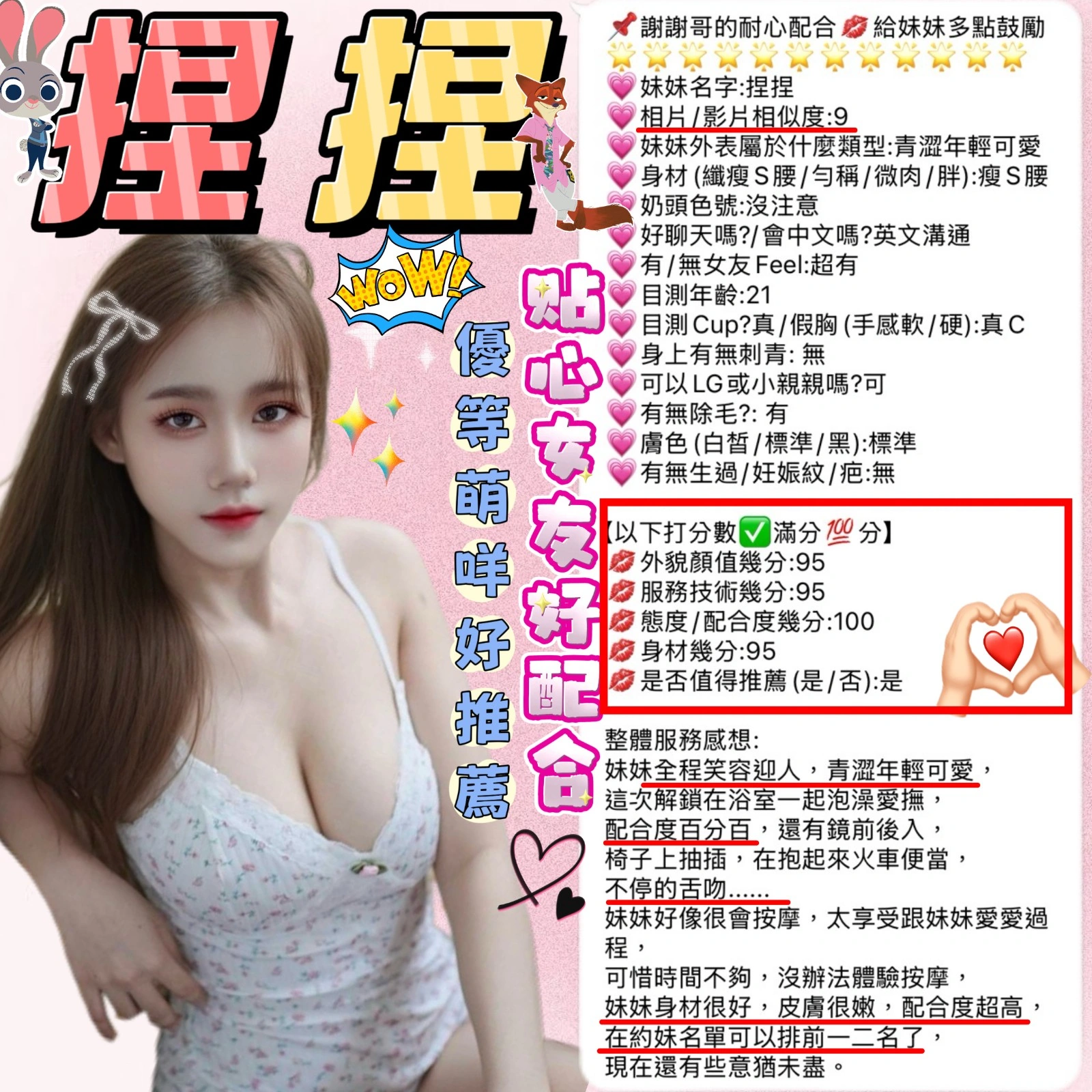 可配合 :奶砲,按摩,69,共浴,LG(舌吻)依氣氛衛生而定,可親嘴,無套吹,口爆,足交,品鮑,舔蛋,奶推,屁推,絲襪,快餐,2S