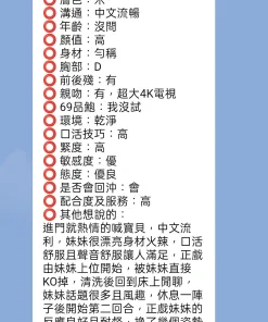 可配合 :毒龍,按摩,69,LG(舌吻)依氣氛衛生而定,可親嘴,無套吹,口爆,品鮑,舔蛋,變裝(自備免付),絲襪,中文溝通,快餐,2S,包夜