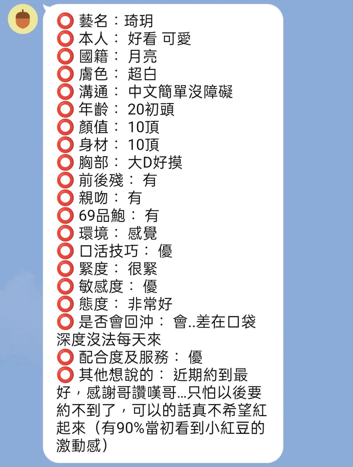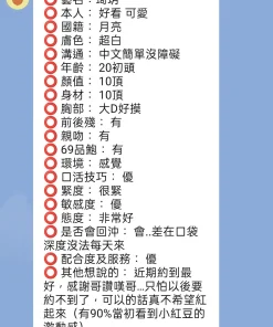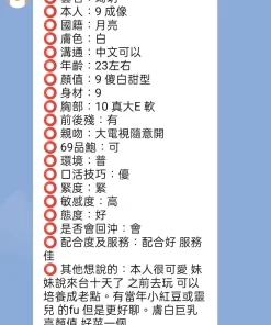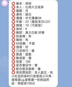 可配合 :按摩,69,LG(舌吻)依氣氛衛生而定,可親嘴,無套吹,口爆,品鮑,舔蛋,變裝(自備免付),絲襪,快餐,2S