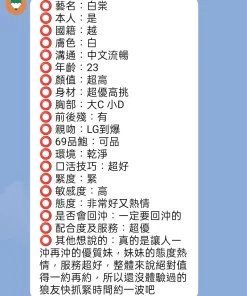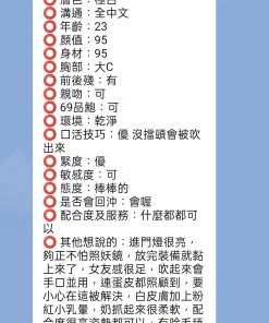 可配合 :奶砲,按摩,69,共浴,LG(舌吻)依氣氛衛生而定,可親嘴,無套吹,口爆,品鮑,舔蛋,絲襪,中文溝通,快餐,2S