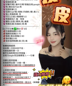 可配合 :按摩,共浴,LG(舌吻)依氣氛衛生而定,可親嘴,無套吹,口爆,品鮑,舔蛋,顏射,浴中蕭,絲襪,玩具(按摩棒),玩具(跳蛋),快餐,2S,NS