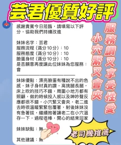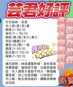 可配合 :奶砲,按摩,69,共浴,泰國浴,可親嘴,無套吹,品鮑,舔蛋,奶推,屁推,浴中蕭,深喉嚨,變裝(自備免付),絲襪(自備免付),快餐,2S