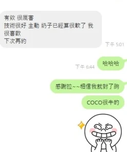 可配合 :按摩,69,共浴,無套吹,口爆,足交,舔蛋,奶推,屁推,冰火,顏射,絲襪,玩具(按摩棒),玩具(跳蛋),自慰秀,中文溝通,快餐,2S