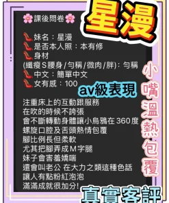 可配合 :奶砲,按摩,69,共浴,LG(舌吻)依氣氛衛生而定,可親嘴,無套吹,口爆,品鮑,舔蛋,艷舞秀,絲襪,玩具(按摩棒),玩具(跳蛋),情趣用品(客自備),自慰秀,攝影,白人,中文溝通,快餐,2S,包夜,射後清槍
