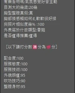 可配合 :奶砲,69,殘廢澡,LG(舌吻)依氣氛衛生而定,可親嘴,無套吹,足交,品鮑,舔蛋,奶推,屁推,浴中蕭,深喉嚨,快餐,2S