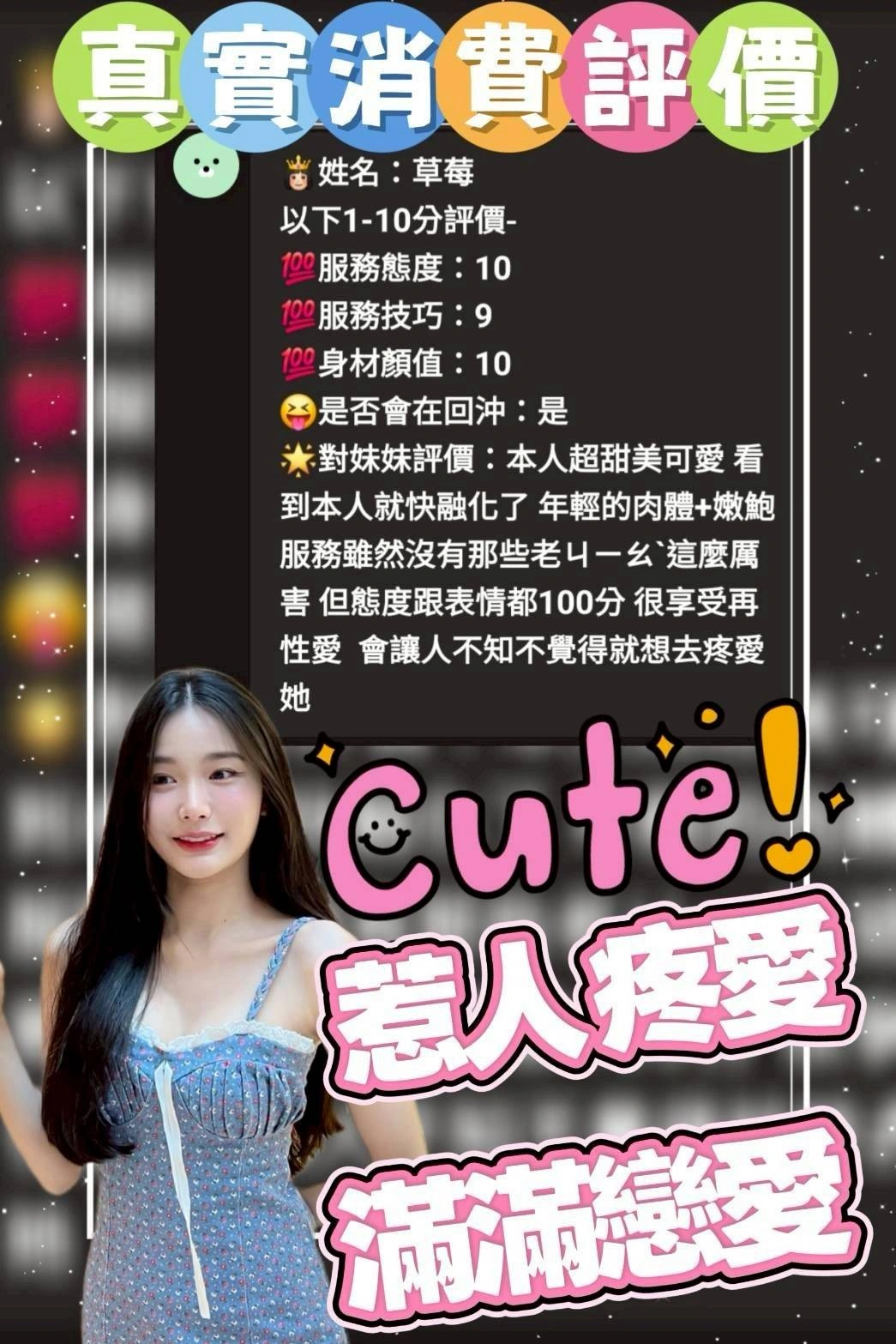 可配合 :按摩,69,共浴,LG(舌吻)依氣氛衛生而定,可親嘴,無套吹,口爆,品鮑,舔蛋,變裝(自備免付),絲襪(自備免付),玩具(按摩棒),玩具(跳蛋),情趣用品(客自備),無套做,無套內射,攝影,快餐,2S