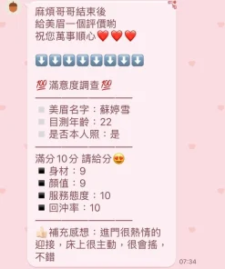 可配合 :奶砲,按摩,69,可親嘴,無套吹,品鮑,舔蛋,奶推,屁推,顏射,變裝,絲襪,玩具(按摩棒),玩具(跳蛋),快餐,2S