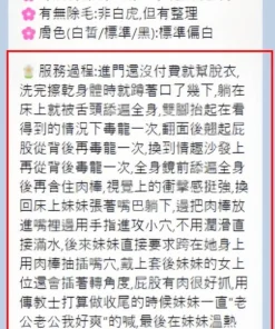 可配合 :奶砲,毒龍,按摩,69,陪洗,共浴,LG(舌吻)依氣氛衛生而定,可親嘴,無套吹,口爆,足交,品鮑,舔蛋,冰火,深喉嚨,艷舞秀,自慰秀,快餐,2S,射後清槍