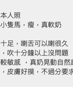 可配合 :奶砲,按摩,69,殘廢澡,LG(舌吻)依氣氛衛生而定,可親嘴,無套吹,口爆,品鮑,舔蛋,奶推,顏射,浴中蕭,深喉嚨,絲襪,自慰秀,快餐,2S,包夜,射後清槍