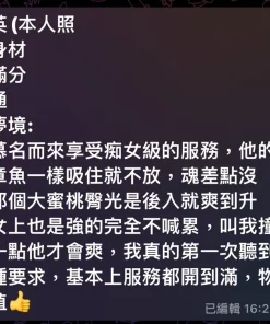 加價項目 : 2S+500,口爆+500,顏射+500,絲襪+100,後門+1000,口爆吞精+1000,無套內射+1000,攝影+1000(不露臉)