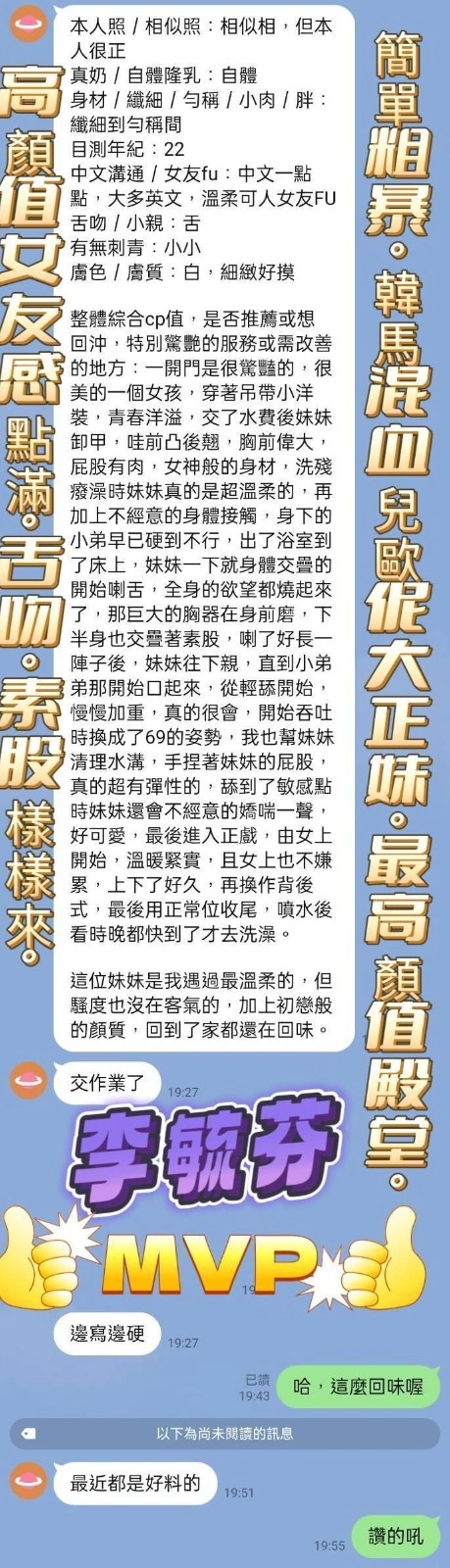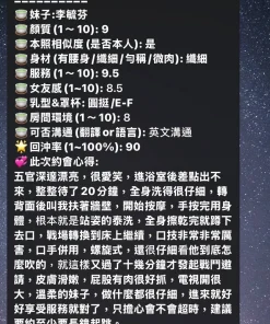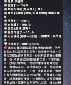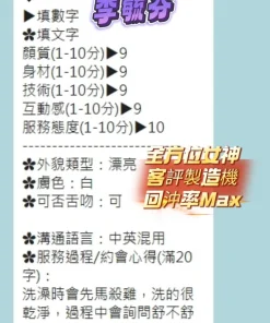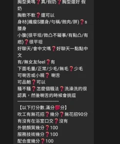 可配合 :按摩,69,陪洗,共浴,LG(舌吻)依氣氛衛生而定,可親嘴,無套吹,口爆,品鮑,舔蛋,快餐,2S