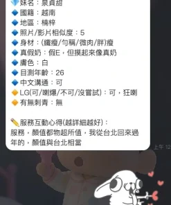 可配合 :奶砲,按摩,69,陪洗,共浴,LG(舌吻)依氣氛衛生而定,可親嘴,無套吹,足交,品鮑,舔蛋,冰火,顏射,深喉嚨,艷舞秀,玩具(按摩棒),玩具(跳蛋),自慰秀,攝影,快餐,2S